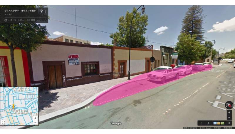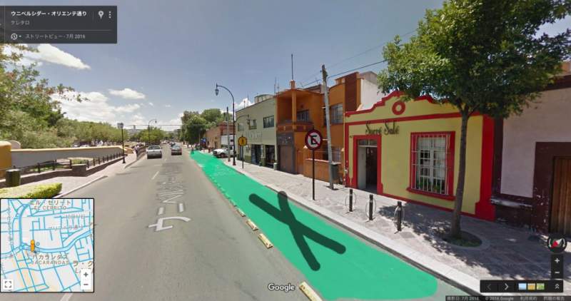 ↓お店の手前のゾーン(緑色)は自転車専用レーンなので車をここに停めてポリシアに見つかるとナンバープレートを持って行かれてしまうので注意です。
